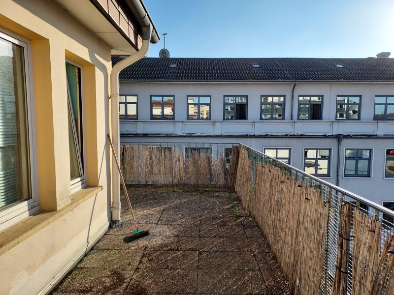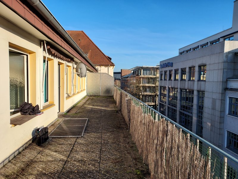 Die sehr große nach Süden ausgerichtete Dachterrasse ist mit Waschbetonplatten belegt und bietet einen herrlichen Blick über die Dächer von Saarbrücken.