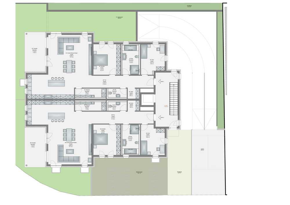 Die Wohnungen im 1. und 2. OG haben ebenfalls eine Wohnfläche von 146,3m² sowie Terrassen mit einer Fläche von 17m².