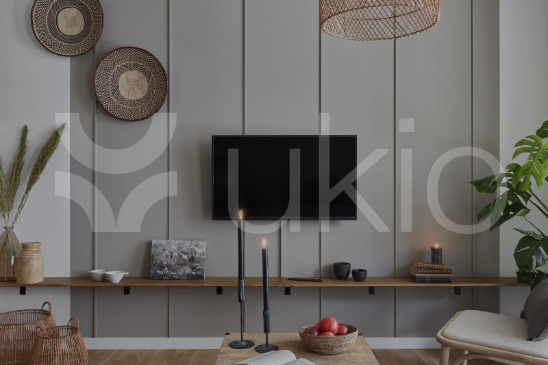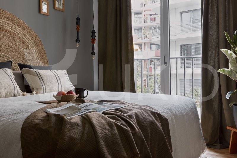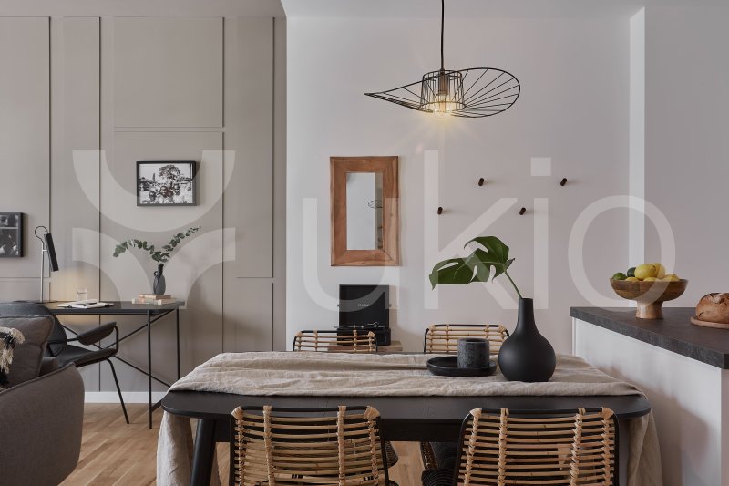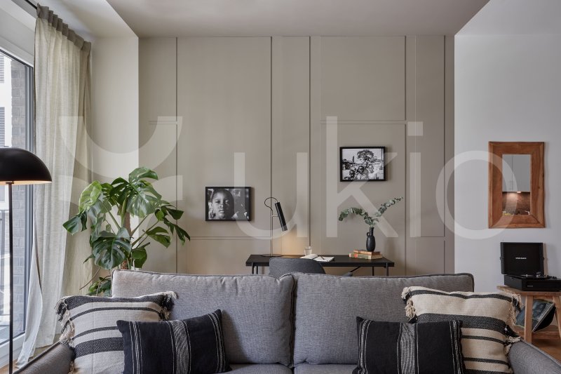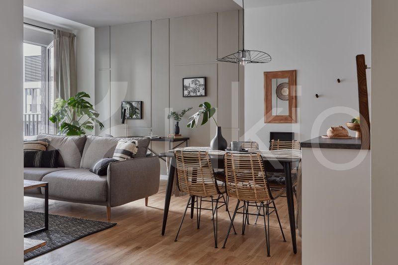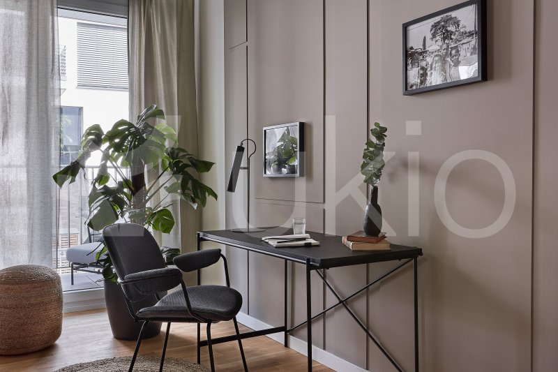 This Tiergarten apartment in Berlin offers a jungle-themed retreat with easy access to local parks and beer gardens. The 1-bedroom, 1-bathroom apartment features a modern design inspired by international travels, with decor sourced from local artisans. The bedroom includes a queen-size bed and ample storage, with light streaming through a Juliet balcony that spans the exterior. The open-plan living area continues the jungle theme, with a comfortable couch that converts to a bed, a full entertainment system, and a custom workstation. The sleek kitchen is fully equipped, and guests can dine indoors or on the balcony. The apartment comes fully furnished, including bedding and linens.