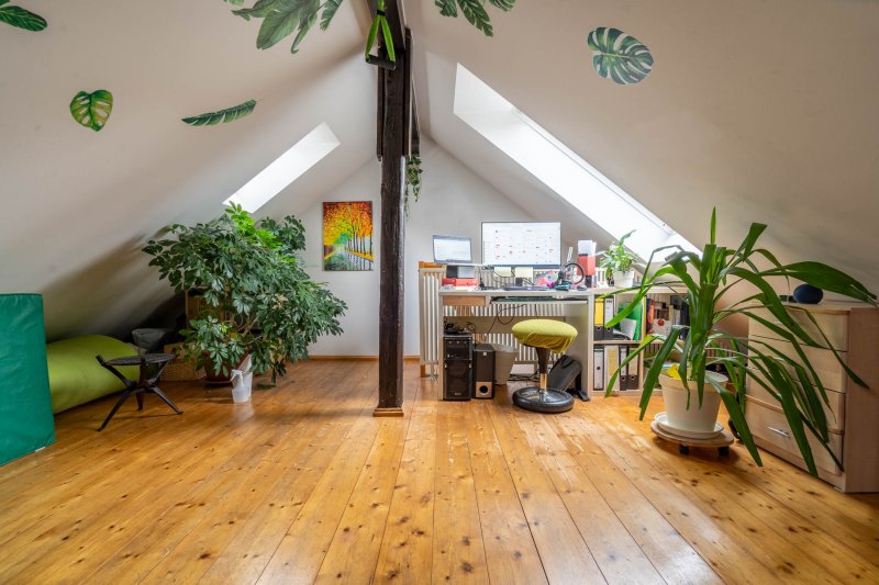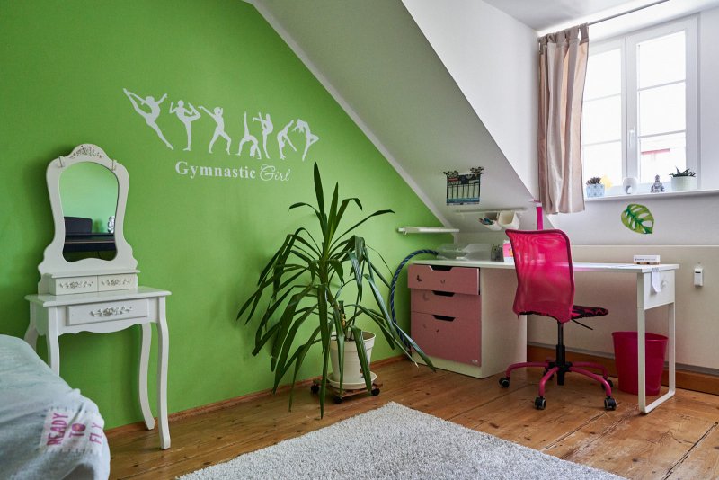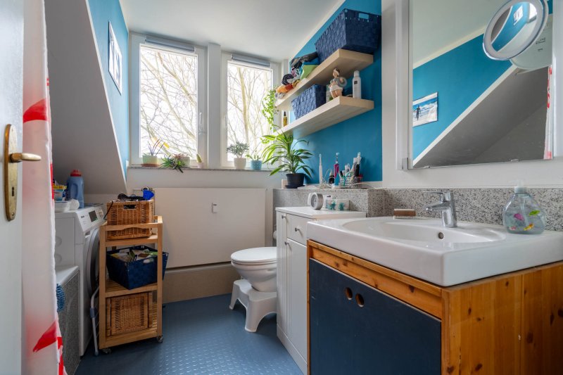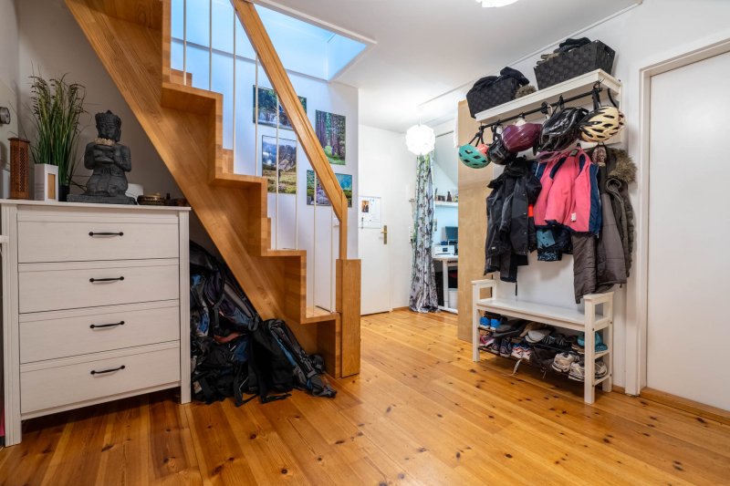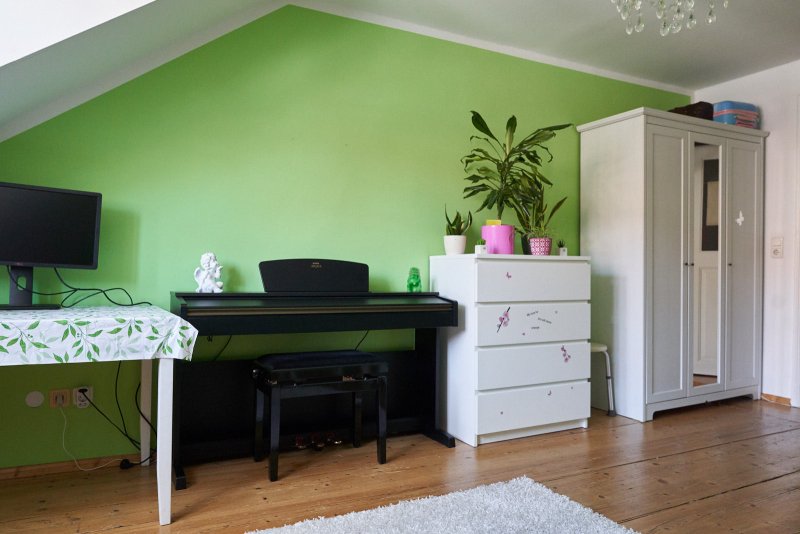 Es ist eine Maisonettewohnung mit Wechselstufentreppe, einem Fahrstuhl im Haus und einer freundlichen Hausgemeinschaft. Die Wohnung ist vollständig möbiliert. Das Badezimmer hat ein Fenster, eine Waschmaschine sowie eine Wanne mit Duschmöglichkeit. Im Kinderzimmer sind ein Schreibtisch, Klavier, Bett, Arbeitstisch, Kommode und Kleiderschrank vorhanden. Das Schlafzimmer bietet ein Doppelbett, großen Kleiderschrank und Kommode.