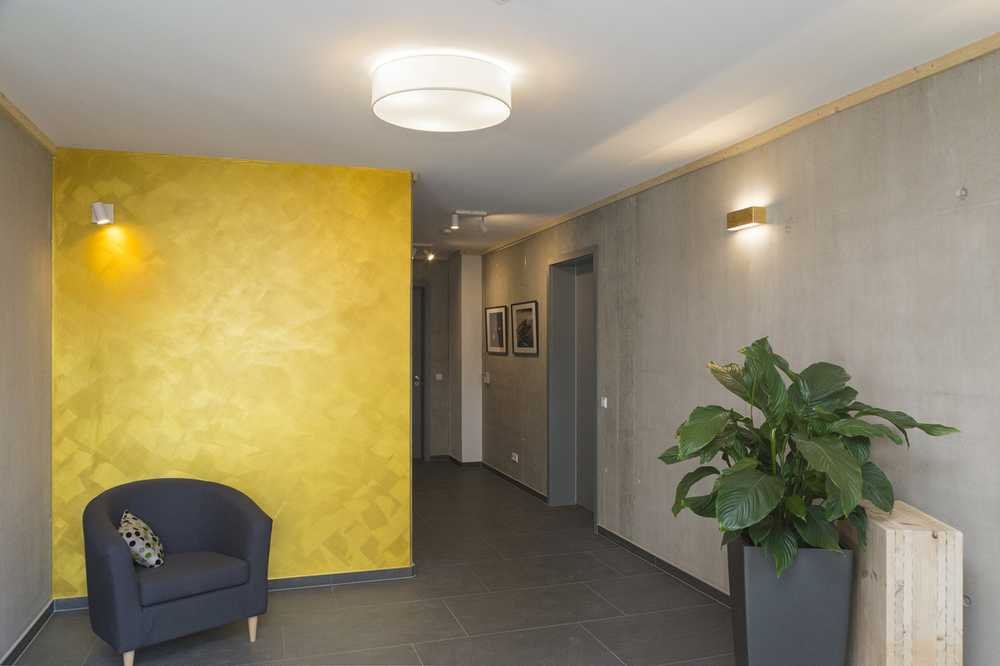Das Besondere an diesem modernen Gebäude ist die weitgehend ökologische Bauweise mit leimfreien und holzschutzmittelfreiem Vollholz. Sie harmonieren bestens mit den sichtbaren Betonflächen, den weiß verputzen Wänden und bieten ein angenehmes Wohnklima.