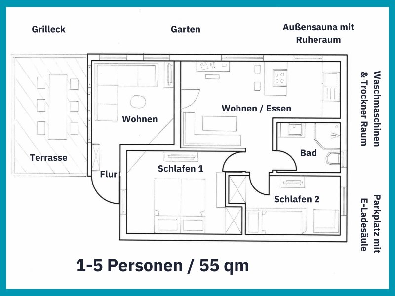 Der Preis ist inklusive Müll, WLAN und Wasserkosten. Strom wird nach Bedarf abgerechnet.