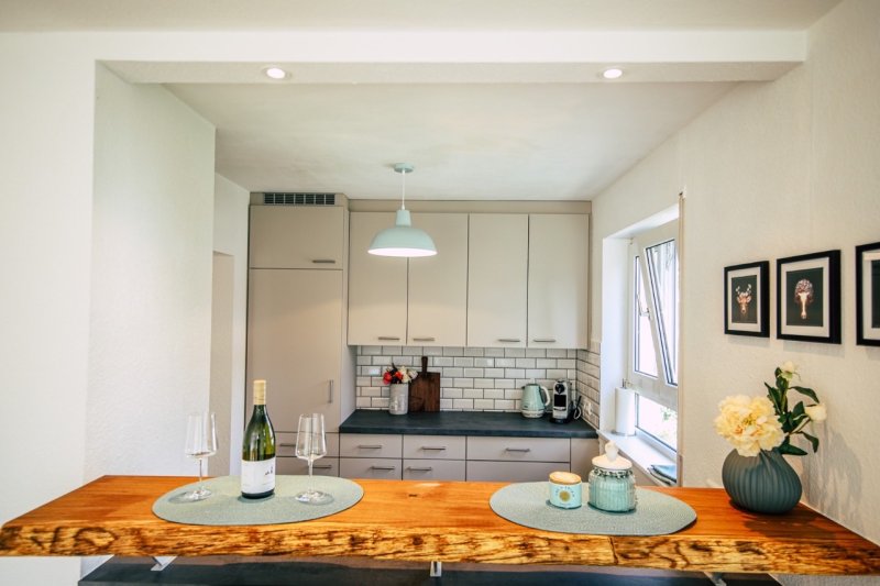 Die Wohnung liegt am Rande von Gundelfingen direkt an der Stadtgrenze zu Freiburg und ist voll hochwertig ausgestattet - modern mit Schwarzwald Flair. Die neue Einbauküche mit Echtholztheke bildet das Herzstück der Wohnung. Die Wohnung ist voll ausgestattet (Töpfe, Teller, Wasserkocher, Waschmaschine etc.) . Im Schlafzimmer erwartet Sie ein hochwertiges Bett aus echtem Altholz aus dem Kinzigtal mit hochwertigen Auflagen.