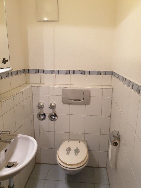 Das Tageslichtbad hat eine Badewanne, eine Dusche, WC und Waschbecken. Zusätzlich gibt es ein innenliegendes Gäste-WC.
