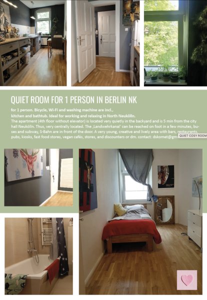 The apartment (4th floor without elevator) is very quiet and is located 5 min from the city hall Neukölln. Thus very centrally located. The Landwehrkanal can be reached on foot in a few minutes, buses and U-Bahn, S-Bahn are virtually on the doorstep. A very young, creative and lively area with bars, restaurants, pubs, kiosks, fast food stores, vegan cafes, stores and discounters. Landwehrkanal 5 min away.