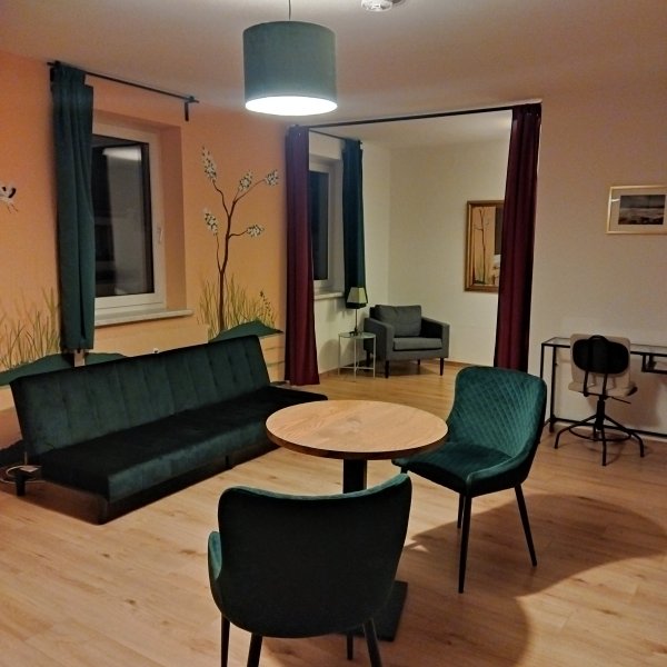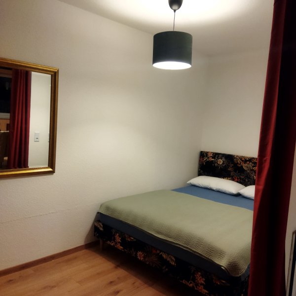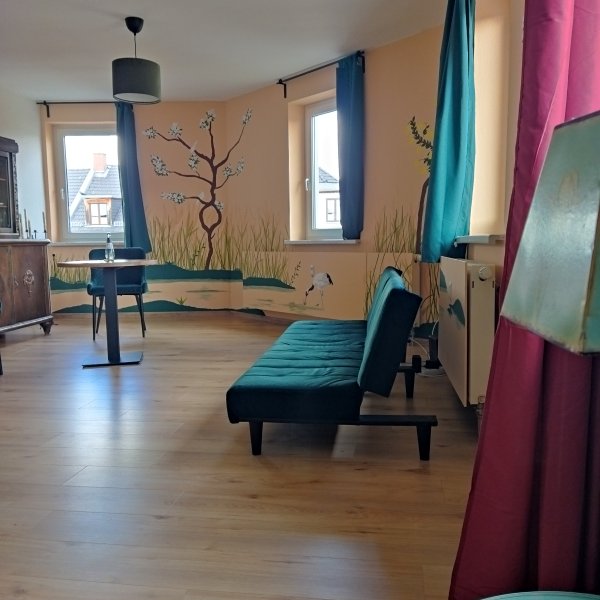 Schlafnische mit 1,60m Bett, Leseecke, kleines Sofa, Arbeitsecke, antike Kommode, Esstisch mit Stühlen, Vorhänge