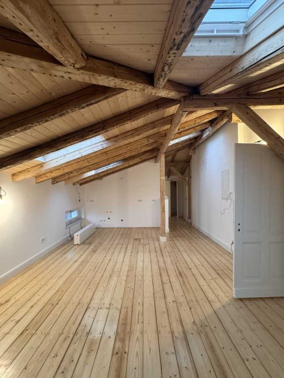 Dachbalken liegen offen und der historische Dielenboden wurde aufgearbeitet, was der