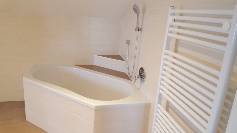 Großes Tageslicht-Bad mit Dusche, Toilette, Waschbecken, Badewanne sowie beheizter Handtuchhalter