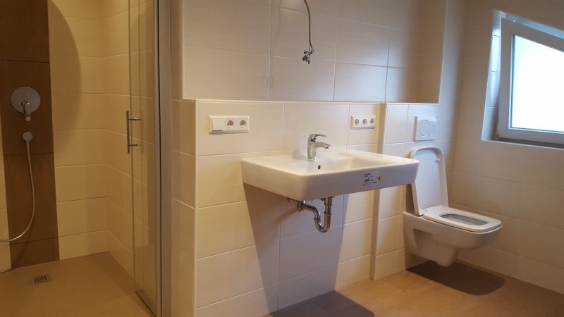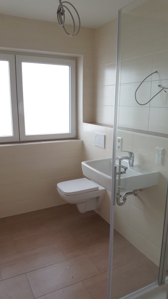 Gästebad mit Dusche, Toilette, Waschbecken