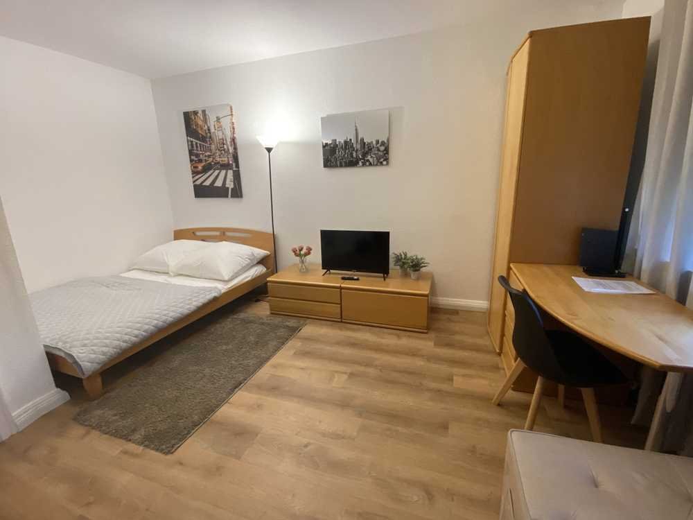 Auf ca. 25 m² erwartet Sie ein Wohn- und Schlafbereich sowie ein offener Küchenbereich mit einer Pantry-Küche (Küchenzeile mit zwei Kochplatten, Spüle, Kühlschrank, Ober- und Unterschränke) und einem Badezimmer mit WC und einem Duschbad. Neben einer gepflegten Einbauküche ist das renovierte und gepflegte Zimmer mit Echtholzmöbeln bestehend aus einem Bett (ca. 140 x 200 m), einem Kleiderschrank, einem Sideboard, einem Arbeitstisch mit einem Bürostuhl sowie einem ausklappbaren Esstisch mit zwei Stühlen, einem großen Fenster mit Rollläden, dass für viel Licht sorgt sowie einer Garderobe mit einem Spiegel im Flur ausgestattet. Ein LED-Fernsehen (Smart-TV), Internet ist ebenfalls vorhanden. Münz-Waschmaschinen mit Trockner sind in der Waschküche vorhanden. Eine Textil-Reinigung befindet sich in unmittelbarer Nähe.