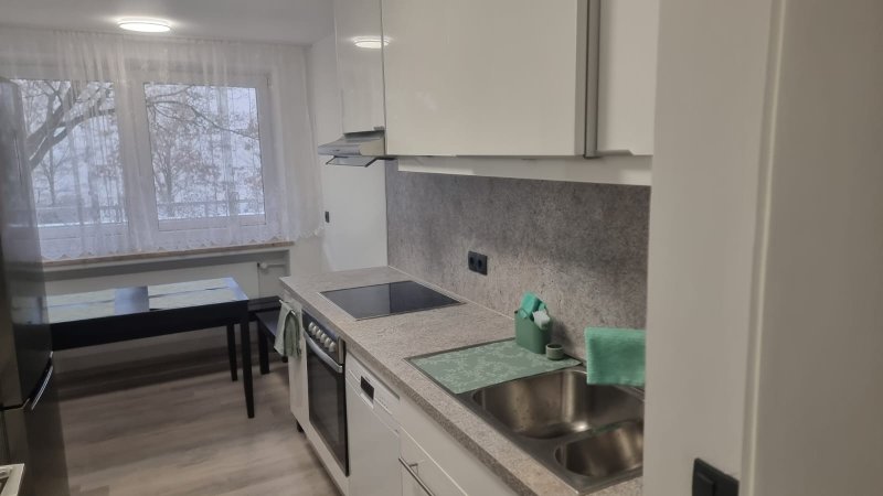 Die helle Küche überzeugt nicht nur durch ein modernes Design und viel Sonnenlicht, sondern auch durch eine zweiseitige Küchenzeile mit vielen Schubladen und einem Küchentisch für gemeinsame WG-Abende. Ein großer Kühl- und Gefrierschrank, Spülmaschine, Induktionsherd, Backofen und Mikrowelle machen das Kochen zu einem Vergnügen.