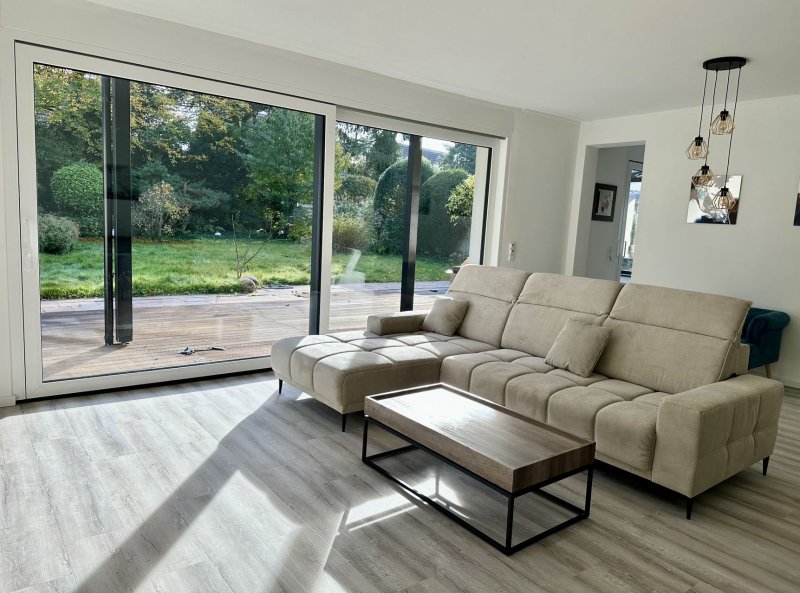 Durch die imposante und massive, rote Eingangstür betreten Sie Ihr neues Reich des puren Wohlbefindens mit 500qm Garten. Drei Schlafzimmer, zwei Badezimmer, eine geräumige Küche sowie ein traumhaftes Wohnzimmer heißen Sie hier willkommen. Der moderne und luxuriöse Stil im Erdgeschoss spiegelt sich an vielen Stellen wider. Geradezu hervor sticht auch die ca. 55 m2 große Bankirai-Terrasse mit Teilüberdachung und ausfahrbarer Markise. Eine zusätzliche und dankenswerte Alternative zum Sonnen und Entspannen ist sicherlich die zweite Terrasse in Südwest-Ausrichtung, die Ihnen herrliche Nachmittage und Sommerabende bescheren wird.