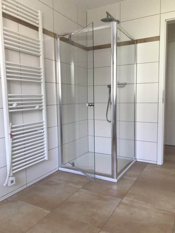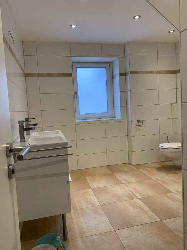 Das große Bad mit Tageslichtfenster hat unter anderem eine Wellnessdusche, großes Waschbecken mit großen Unterschrank mit Auszugschubläden, großen Handtuchheizkörper usw..