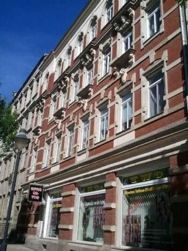 Das Gebäude ist ein 4-stöckiges unterkellertes Wohn- und Geschäftshaus. Im Erdgeschoss befinden sich eine Gewerbeeinheit und in den Obergeschossen mit angebautem Hinterhaus wurden 12 hochwertig ausgestattete Wohneinheiten geschaffen. Die zu vermietende renovierte, gut geschnittene 3-Raum-Wohnung befindet sich im 2.Obergeschoß des Vorderhaus des sanierten Altbaus. Neben einem großzügigen Wohnzimmer verfügt die Wohneinheit über einen Balkon, der von einem der Schlafzimmer aus begehbar ist, ein Bad mit Wanne sowie ein separates Gäste-WC. Der Waschmaschinenanschluss befindet sich in der großen Küche. Eine Einbauküche befindet sich ebenfalls in der Wohnung, ist jedoch ohne Ablöse im Mietpreis drin und kann nach eigenen Vorstellung umgestaltet oder komplett erneuert werden.