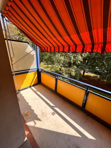 Zur Wohnung gehört ein schöner Balkon inklusive Markise und ein Kellerraum.