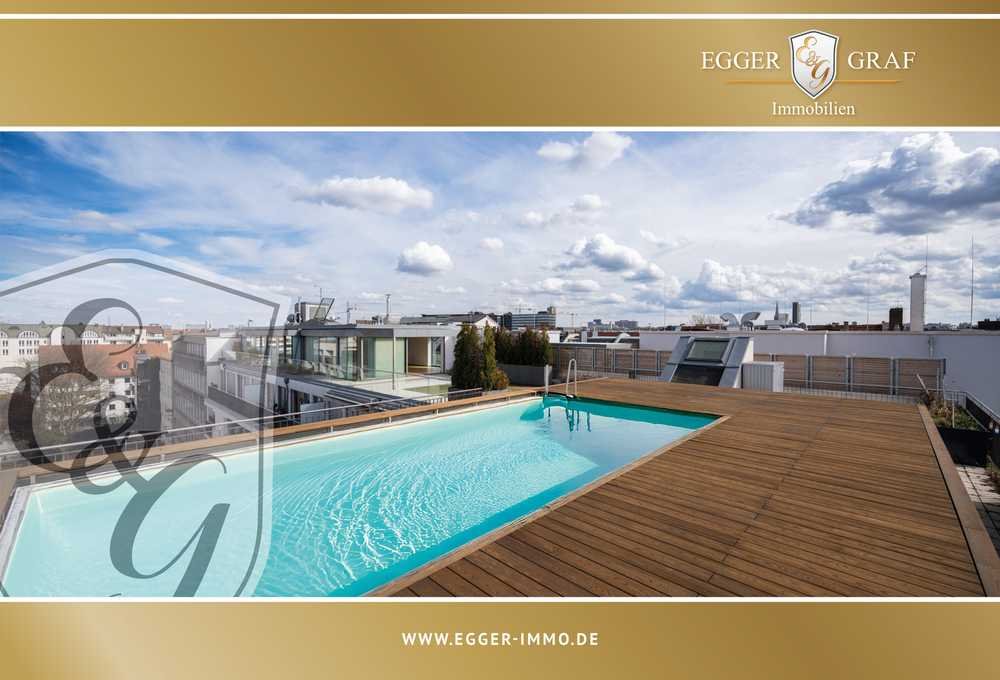 Die private Dachterrasse eröffnet einen atemberaubenden 360-Grad-Blick über die Skyline der Stadt – ein Panorama, das Tag und Nacht begeistert. Absolutes Highlight: Ihr eigener Rooftop-Pool, der urbanes Wohnen auf ein neues Niveau hebt. Hier genießen Sie unvergleichliche Privatsphäre und luxuriöse Entspannung über den Dächern Münchens.