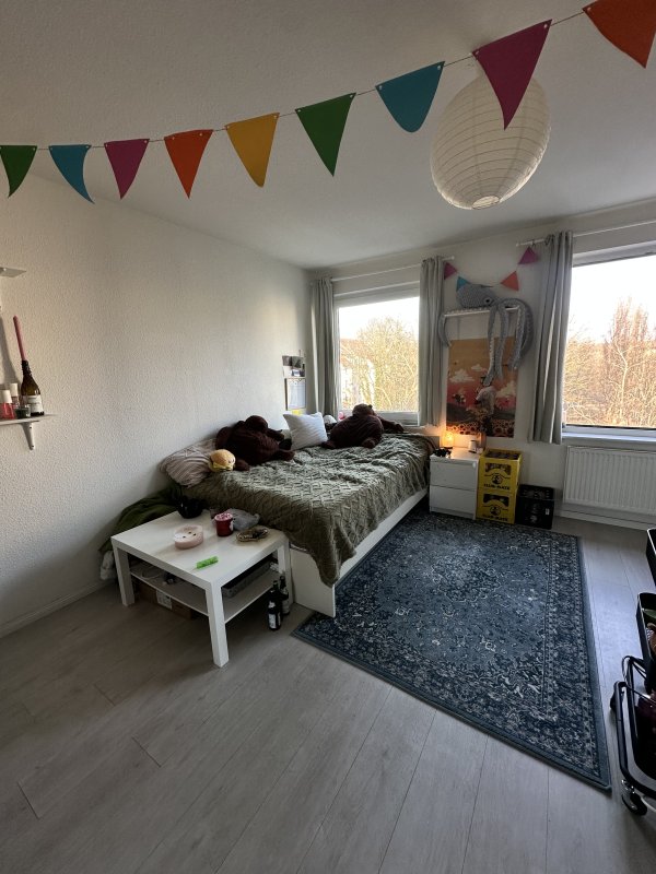 Die WG besteht aus drei entspannten Mitbewohner*innen, die offen für gemeinsame Abende sind, aber auch ihren eigenen Raum haben. Die Wohnung verfügt über eine voll ausgestattete Küche, ein Bad mit Dusche und Waschmaschine sowie genügend Stauraum.