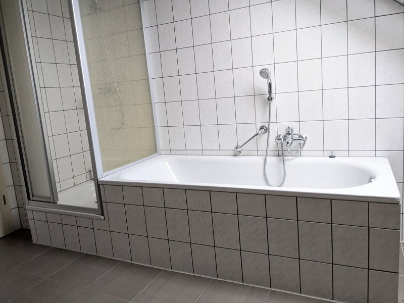 - Helles Badezimmer mit Badewanne, Fenster und Waschmaschinenanschluss