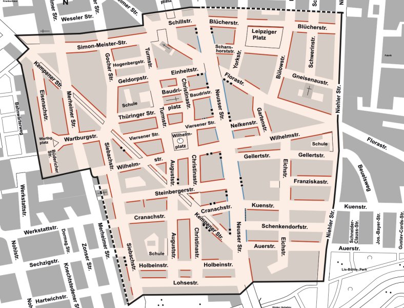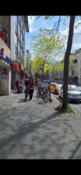Nähe McDonalds in einer verkehrsberuhigten Seitenstraße. Und auf der Neusser Str. tobt das Leben