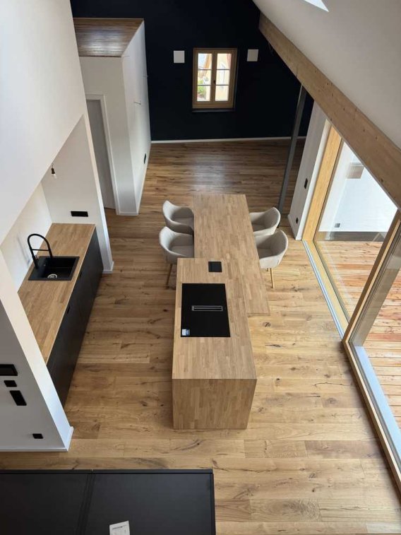 Designer Einbauküche mit Kochinsel und Eiche Massivholz-Esstisch und Bestuhlung für 4 Personen. Leuchten, Badspiegel etc. Chillout-Liegefläche ca. 2x2m mit Kissen auf der Galerie. Digitaler Zugang. Vodafone Internetanschluss bis 1000 Mbit. Mietpreis = netto Kaltmiete.