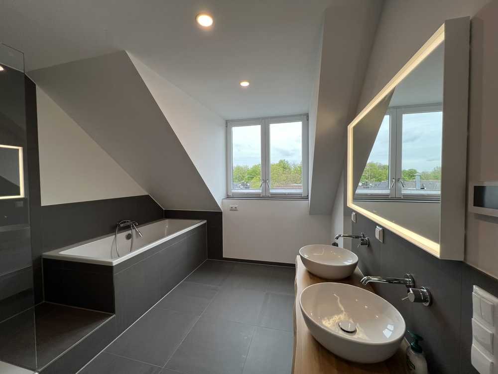 - Geräumiges Bad inklusive 2-Personen-Badewanne und Regendusche