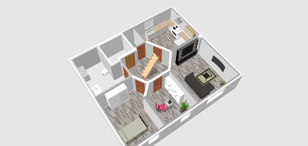 Die Wohnung befindet sich im Dachgeschoss eines Vierfamilienwohnhauses und erstreckt sich über zwei Etagen. Vom Flur aus sind das Bad, die Küche und weitere drei Zimmer zu erreichen und über eine kleine Treppe die beiden Räume im oberen Dachgeschoss .