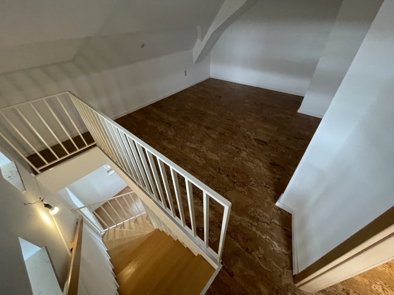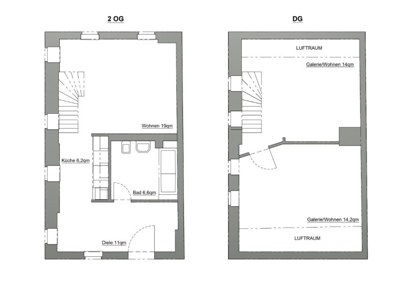 Die untere Ebene im 2OG des Hauses beherbergt einen großen Flur, eine gut ausgestattete offene Küche, ein Bad mit Wanne und ein helles Wohnzimmer. Ein Treppenelement verbindet im Wohnbereich das Obergeschoss mit dem Dachgeschoss zu einer Einheit. Im oberen Bereich befindet sich genug Platz zum Einrichten eines Schlafzimmers und eines Kinderzimmers, oder eines Ateliers mit direktem Blick auf die Elbe.