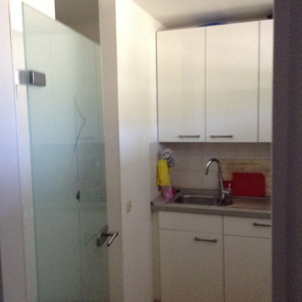 Die Küche besteht aus einer Einbauküche in weißlack.