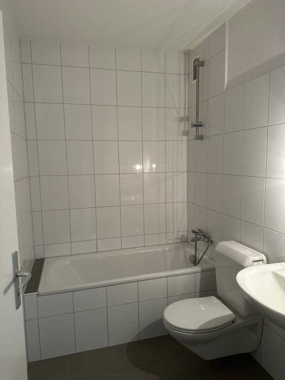 Ein separates WC und ein Wannenbad mit Waschmaschinenanschluss bauen wir gerade neu für Sie ein. Die gesamte Wohnung wir mit einem PVC Planke Boden in heller Optik ausgestattet und tapeziert sowie weiß gestrichen.