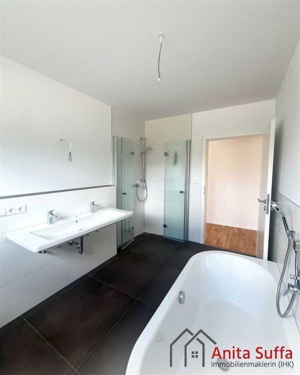 Das moderne Badezimmer lässt keine Wünsche offen: Es verfügt über eine Badewanne, eine bodengleiche Dusche, Waschbecken, WC sowie Anschlüsse für Waschmaschine und Trockner – alles in stilvollem Design. Zwei weitere Zimmer, darunter das ruhig gelegene Schlafzimmer mit Ankleidebereich und ein gemütliches Kinderzimmer, runden das Raumangebot ab.