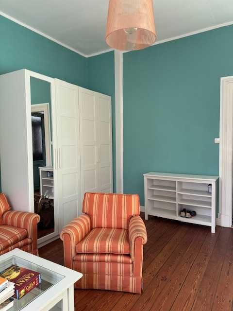 Das helle Gartenzimmer (28 qm) liegt im Erdgeschoss. Es ist ein geräumiges, wunderschönes helles Zimmer mit über 3 Meter Deckenhöhe und einer eigenen kleinen Einbauküche mit Kühlschrank, Herdplatten und Spüle. Das sehr aufgeräumte moderne Bad teilen sie sich mit 2 anderen berufstätigen Personen.
