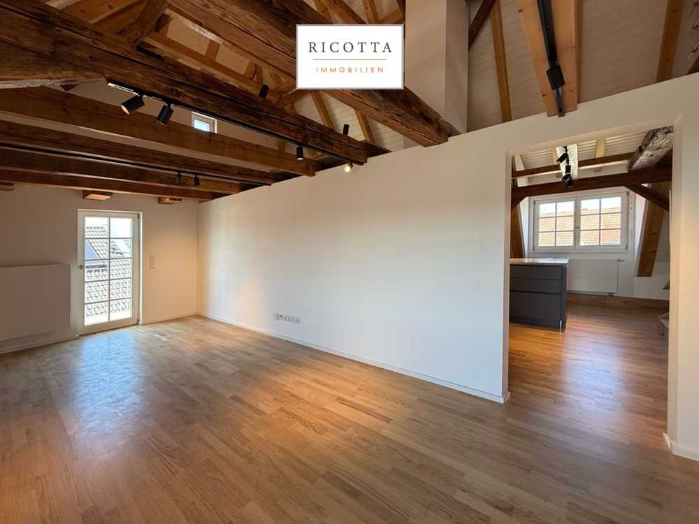 Beim Betreten der schönen Dachgeschosswohnung eröffnet sich über eine elegante Holztreppe der lichtdurchflutete Galerie- und angrenzende Wohnbereich. Hier setzen detailverliebte Elemente wie die moderne Glasabtrennung, die doppelt verglasten Sprossenfenster und die imposanten, freigelegten Holzbalken eindrucksvolle Akzente und verleihen der Einheit ihren unverwechselbaren Charakter. Rechts erstreckt sich der großzügige Wohn- und Essbereich mit direktem Zugang zu einem sonnigen Südbalkon — ein herrlicher Platz zum Entspannen und Genießen. Die moderne, großzügig gestaltete Küche ist mit einer hochwertigen Einbauküche, edler Granitarbeitsplatte und Abluftsystem nach außen ausgestattet. Auch hier findet sich ausreichend Raum für einen zusätzlichen Essbereich, ideal für gesellige Abende. Die charmanten Altbauholzbalken durchziehen den gesamten Wohnbereich und unterstreichen zusammen mit dem durchdachten Lichtkonzept die warme, einladende Atmosphäre.