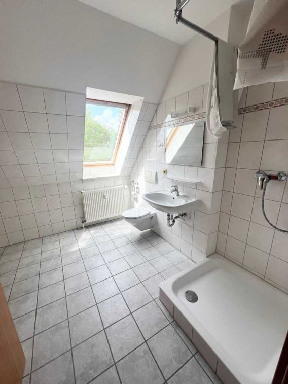 Das Bad ist gefliest und mit einer Dusche ausgestattet.