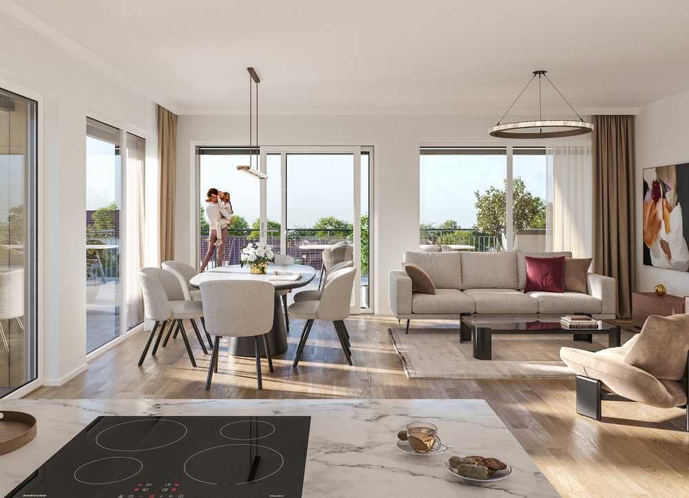 Die Wohnung W 1.1.2 ist eine 3-Zimmer-Wohnung mit ca. 78,10 m² Wohnfläche im 1. Obergeschoss. Zur Wohnung gehört ein Balkon mit ca. 5,76 m² (Nutzfläche) und ein Tiefgaragen-Stellplatz. Die Terrasse ist nach Süd-West ausgerichtet.