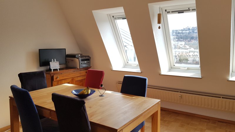 Die Wohnung befindet sich im Dachgeschoss mit toller Aussicht auf den Bopserwald, hat 2 große Zimmer, ist ca. 63 m² groß (Dachschrägen, Grundfläche ca. 73 m²), mit Parkett (im WZ), Badewanne, separates WC, begehbarem Kleiderschrank, Abstellkammer, Garten-Mitbenutzung, schnellem WLAN, TG-Stellplatz. In der Küche ist ein großzügiger Home-Office-Arbeitsplatz eingerichtet. Die Wohnung ist komplett möbliert und voll ausgestattet. Mietpreis incl. Heizung, Strom, Internet, TG-Stellplatz.