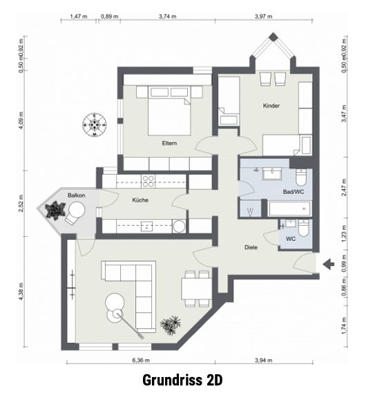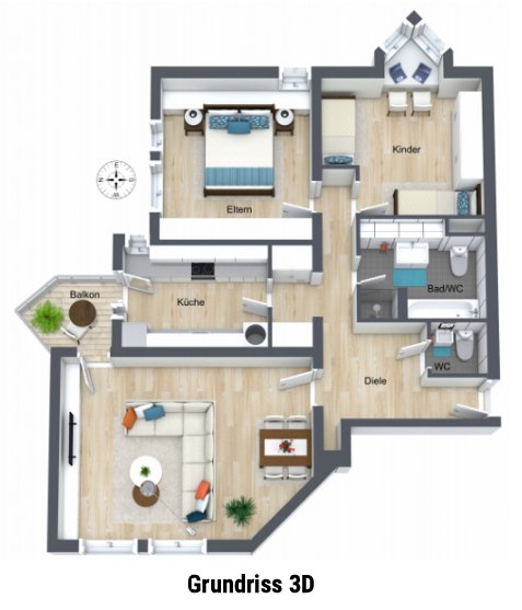 Über eine geräumige Diele mit Platz für die Garderobe gelangen Sie in das große Wohn- und Esszimmer mit Zugang zum Balkon nach Norden. Von der Küche aus gibt es ebenfalls einen Zugang zum Balkon. Das Eltern-Schlafzimmer, das Kinderzimmer, das innenliegende Bad mit Dusche und Wanne und ein zusätzliches separates Gäste-WC runden das angenehme Wohnambiente ab.