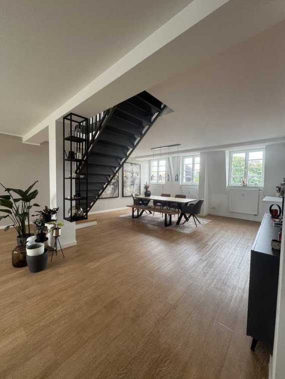 Über einen offenen Eingangsbereich mit Garderobe und Zugang zum Gäste WC gelangt man im dritten Obergeschoss des Hauses direkt in den offenen und großzügigen Wohn- und Essbereich der Wohnung. Über dem Wohnzimmer sind große Oberlichter, die über zusätzliche Beleuchtung verfügen und von Fachwerkbalken eingefasst sind. Zwischen dem Wohn- und Essbereich befindet sich eine große Freitreppe, die die beiden Bereiche voneinander abgrenzt, ohne dabei die offene Atmosphäre des Raums zu beeinflussen. Direkt an den Essbereich schließt eine großartige Einbauküche der Marke Leicht mit Elektrogeräten des Premiumherstellers Gaggenau.