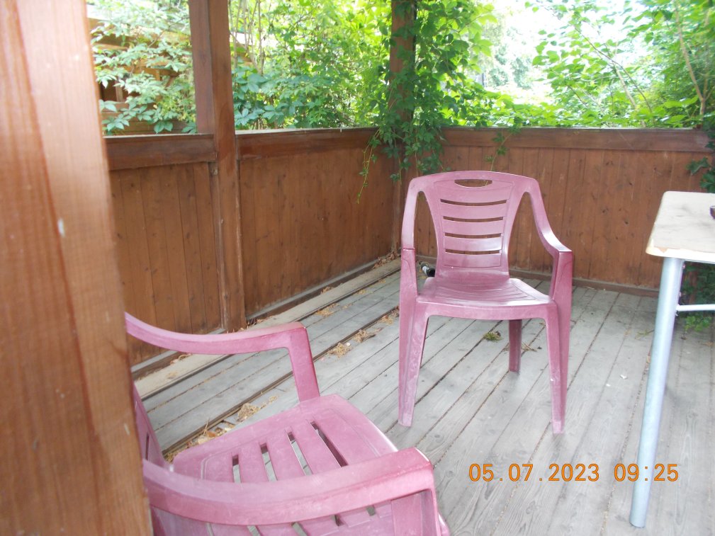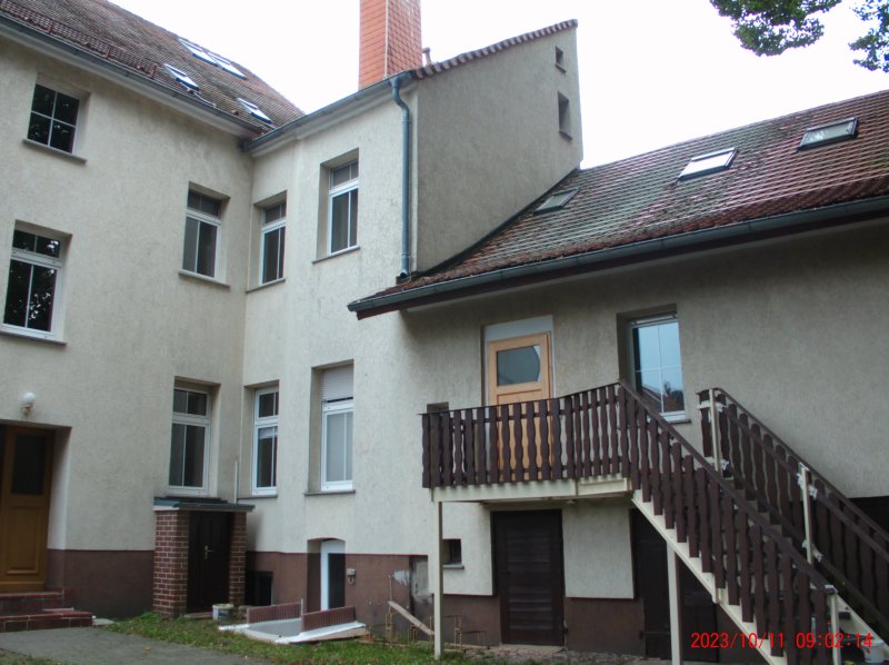 Wir vermieten das Seitengebäude an unserem Haupthaus an solvente Interessenten ohne Haustiere. Es ist für Gehbehinderte nicht geeignet, denn es ist direkt über eine Außentreppe vom Hof aus erreichbar. Innen gibt es noch einmal eine steile Treppe, die Unter- und Obergeschoss miteinander verbindet. Die sehr kleine Einbauküche hat kein Fenster. Im Gebäude befindet sich nur eine neue Duschkabine, aber keine Badewanne. Das Seitengebäude liegt direkt an der schönen Teichpromenade, wo Sitzbänke zum Verweilen einladen. Vom Wohnzimmer haben Sie einen Blick auf den Teich.