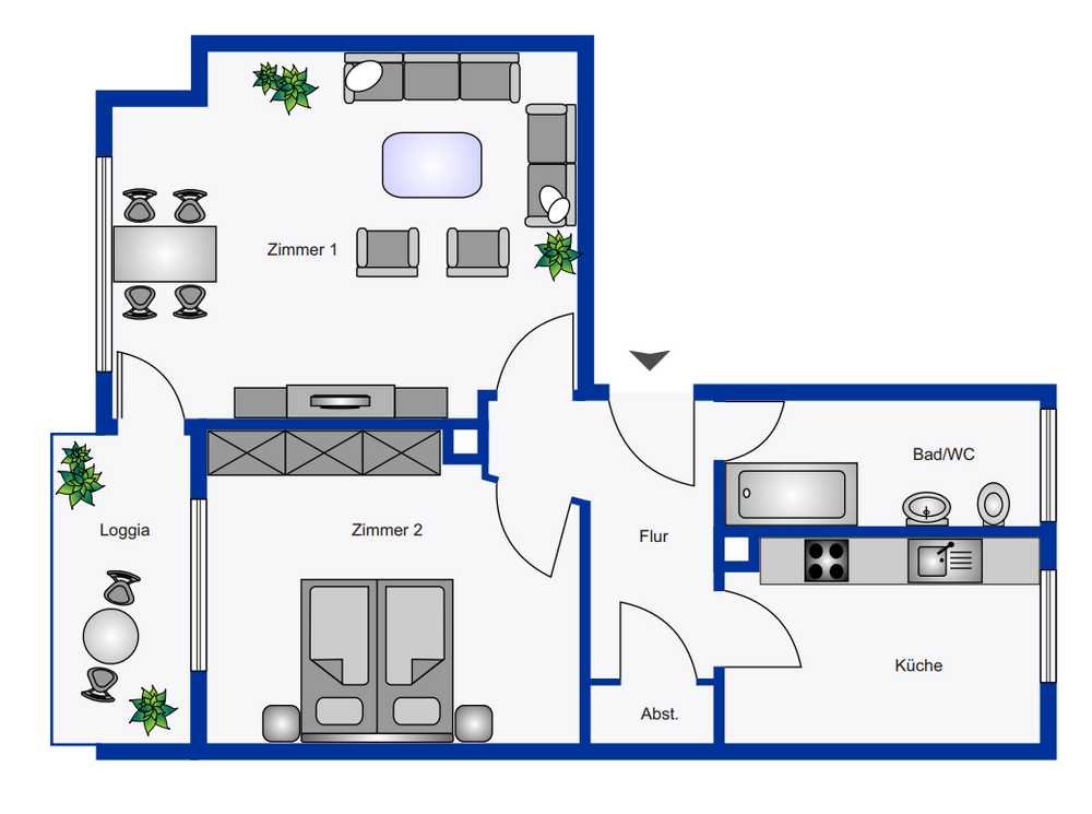 Zur Wohnung gehören außerdem ein großzügiges Wohnzimmer sowie ein gemütliches Schlafzimmer. Eine Loggia rundet das Angebot ab und bietet zusätzlichen Raum im Freien.