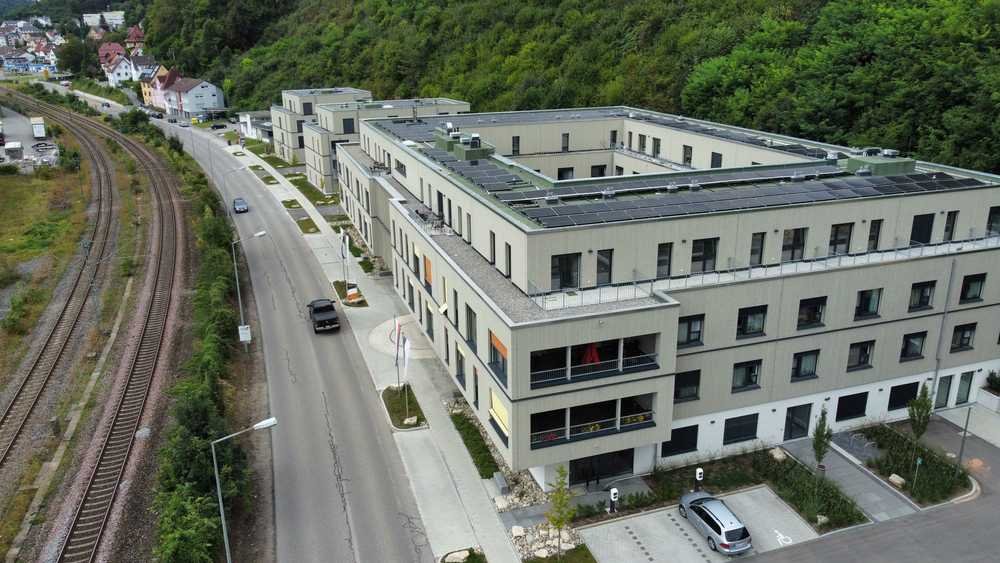 Nachhaltiger Bau: Bei der Erstellung des Holz-Hybrid-Baus wurden vorrangig nachwachsende Baumaterialien verwendet. Das Solardach generiert Strom zum Eigenverbrauch für das Haus und die elektrisch betriebenen Fahrzeuge des ambulanten Pflegedienstes.