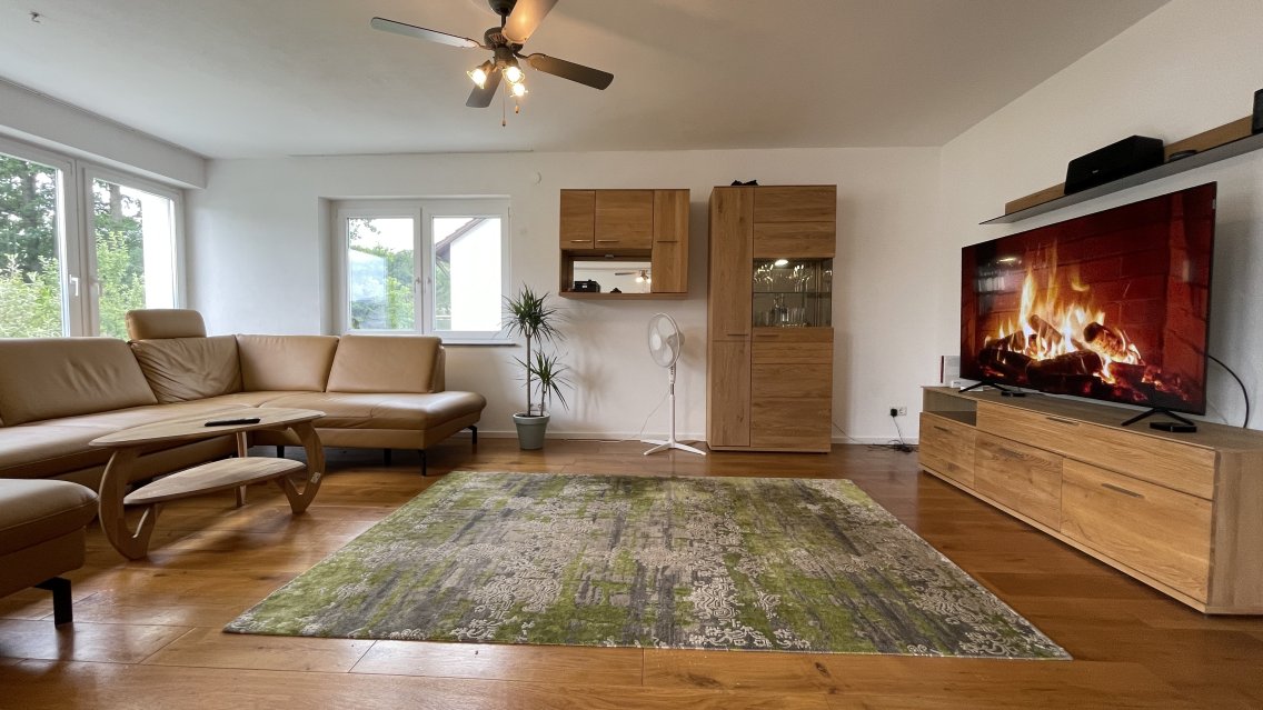 Fully fitted kitchen w. all appliances. new exclusive furnitures, 85“ TV, Rolf Benz leather couch, dining room, old oak wood parquet.