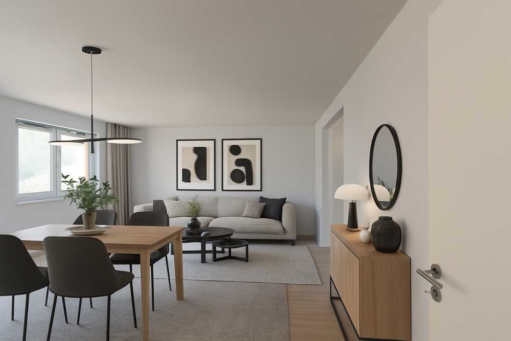 Zwei gut geschnittene Schlafzimmer bieten flexible Nutzungsmöglichkeiten – als klassisches Schlafzimmer, Kinderzimmer oder Homeoffice. Der offen gestaltete Wohnbereich vereint Küche, Ess- und Wohnzimmer in einem hellen, einladenden Raum mit Blick ins Grüne. Großflächige Fensterflächen lassen Licht und Luft frei zirkulieren. Alle Räume sind mit dreifach verglasten Fenstern und einer modernen Fußbodenheizung ausgestattet. Dunkle Großformatfliesen unterstreichen das klare, elegante Ambiente.