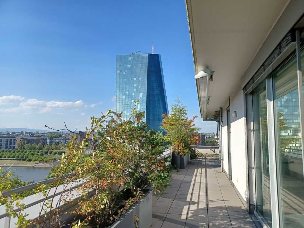 Das Penthouse im Maisonettestil liegt direkt am Mainufer und bietet von der imposanten, umlaufenden Terrasse im 8. Obergeschoss, einen fantastischen Panoramablick auf die Frankfurter Skyline, den Main sowie den Taunus, den Odenwald und die gegenüberliegende EZB.