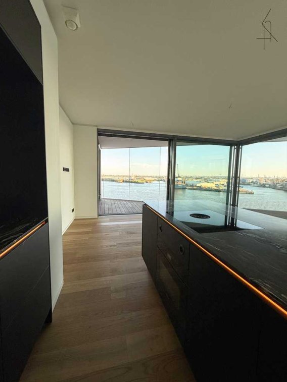 Willkommen in einer der wohl schönsten Wohnungen an der Elbe. Diese representative Neubau-Residenz vereint modernes Design, erstklassige Bauqualität und eine unvergleichliche Lage. Das Apartement befindet sich im 6.OG des von Ingenhoven Architects entworfenen Wohnkomplex „The Crown“ auf der Spitze der HafenCity-Halbinsel Strandkai. Auf 112qm erwarten Sie großzügige Wohnflächen, lichtdurchflutete Räume und ein von jedem Zimmer zu genießender spektakulärer Panoramablick-und das gleich von drei Balkonen. Ausgestattet mit drei Zimmern auf ca. 112qm Wohnfläche bietet es von jedem Zimmer einen unverwechselbaren Elbblick. Neben dem en-suite Masterbad mit freistehender Badewanne und Elbblick bietet es ein hochwertiges Gäste-Bad. Die Bäder sind mit hochwertigen Materialien wie Corian, Marazzi Fliesen und Armaturen von Herzbach & Decor Walther sowie Fußbodenheizung ausgestattet.