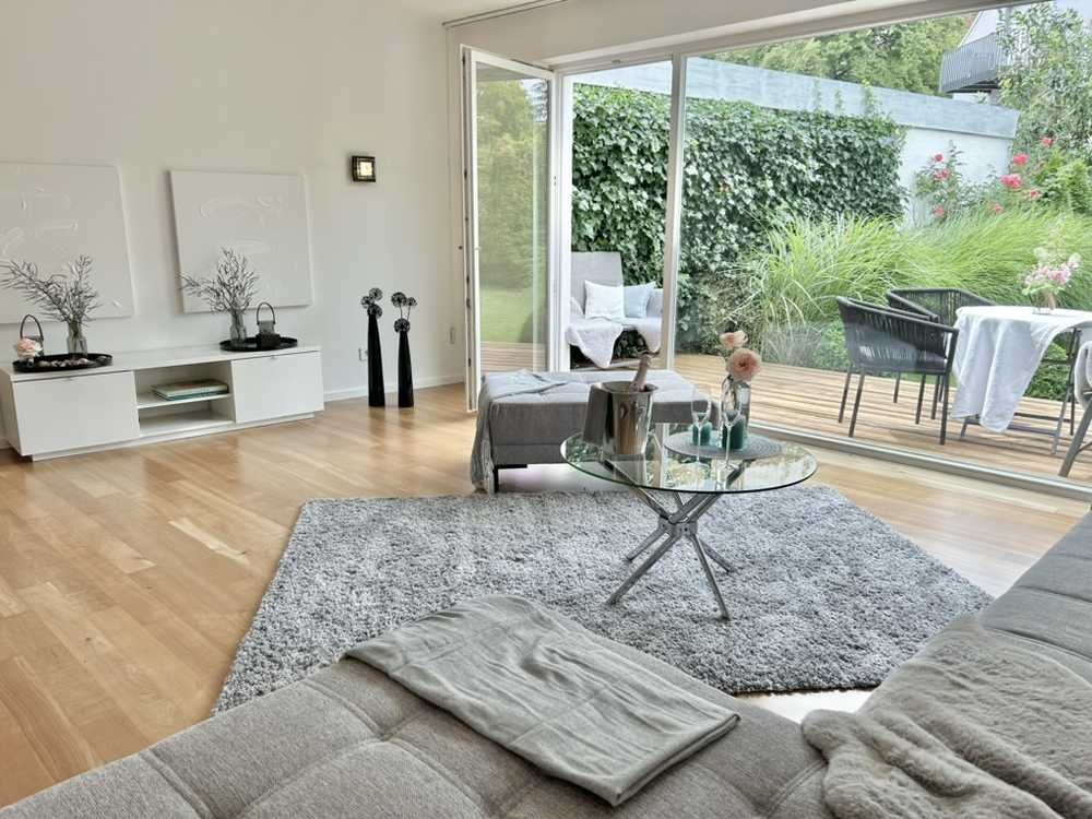 Bei dieser aussergewöhnlich seltenen Immobilie handelt es sich um eine Erdgeschosswohnung in einem Anbau eines modernen Architektenhauses.