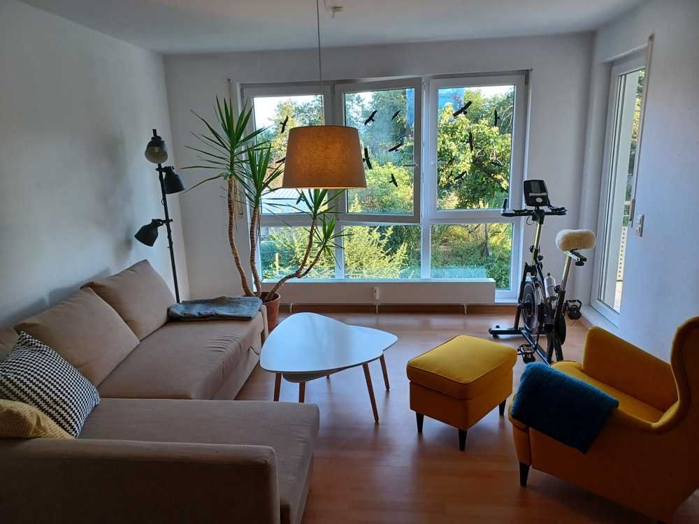 - Geräumiges, offenes Wohn- & Esszimmer mit Fensterfront. Blick in die Natur, ausgestattet mit Sofa (ausziehbar), Kissen & Decken, Beistelltischen, Sessel, Teppich, Sesselstühlen, Leuchten, Steh- & Leselampen und grosser Palme. Direkter Zugang zu großem Balkon. Möbelzukauf nach Absprache
