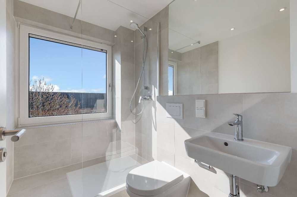 Auch das moderne Badezimmer lässt keine Wünsche offen. Großformatige Fliesen in hellgrau geben dem Badezimmer einen stilvollen Look. Es wurden hochwertige Armaturen von GROHE und Keramik von Villeroy & Boch verbaut.