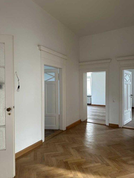In den Wohnräumen sind an den Decken edle Jugendstilverzierungen vorhanden. Der im der Küche-/Essbereich original vorhandene Parkettboden ergänzt das außergewöhnliche Ambiente perfekt.