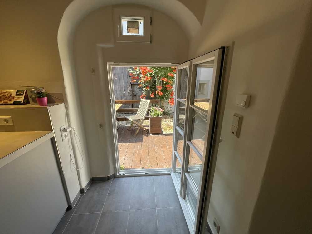 Kurze Wege aus der Küche ermöglichen den direkten Weg zur Terrasse oder auch über die neu gestaltete Eingangstür.