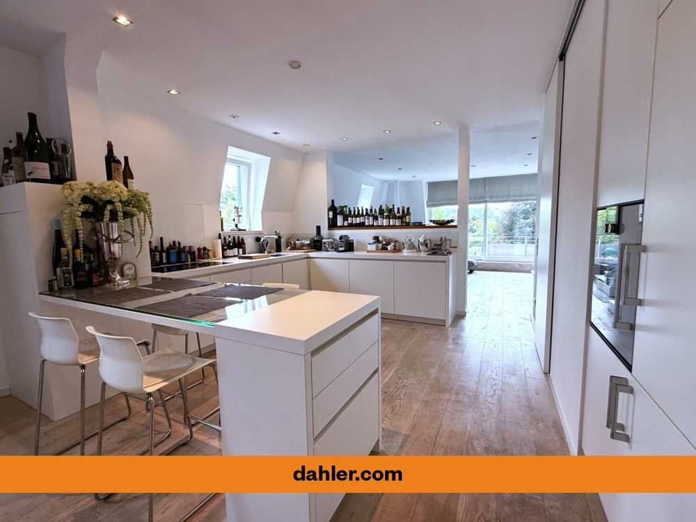 Die modern geschnittene Wohnung spiegelt Stil und Lebensart ihrer Bewohner. Der Eingangsbereich ist groß genug für eine Garderobe und zum Beispiel einen kleinen Arbeitsplatz. Von hier aus geht es nach links in das Herz der Wohnung: die luxuriöse Einbauküche mit angrenzendem Hochtisch mündet in den offenen Wohnbereich mit bodentiefer Panorama-Schiebetür auf den Balkon. Auf der entgegengesetzten Seite führt momentan noch eine Treppe, die zurück gebaut wird, in die Dachgeschosswohnung. Dort könnte dann auch noch ein Essplatz eingerichtet werden.
